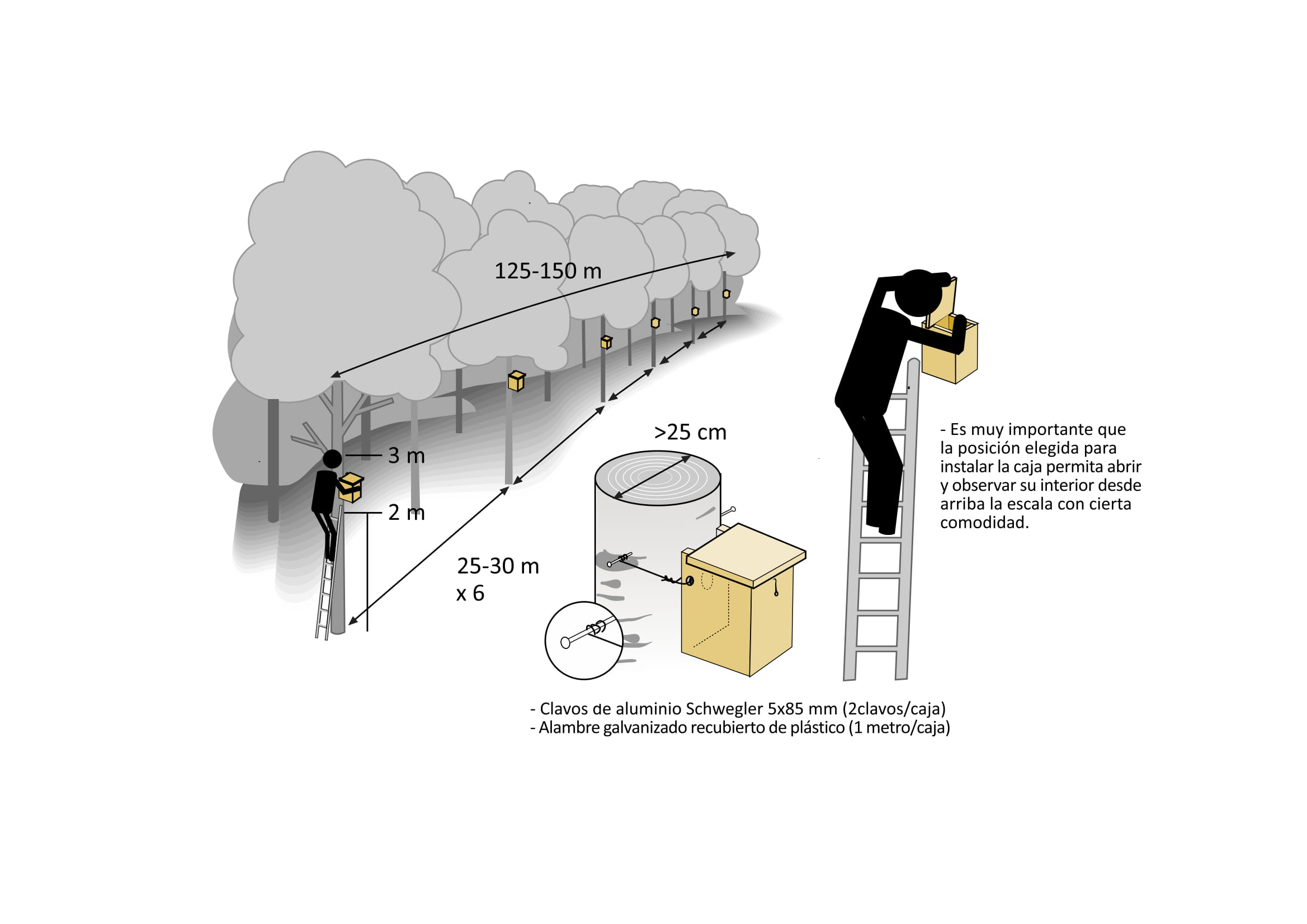 Las cajas se numerarán y colocar en línea (estación lineal) a una distancia de 30 metros entre ellas y a unos 2,5 o 3 metros del suelo.