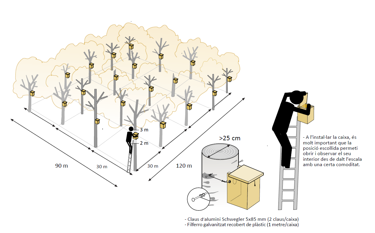 Les caixes s'han de numerar i col·locar en format parcel·la de 4 files, amb 5 caixes cada una, a una separació de 30 metres entre elles dalt els arbres, a uns 2,5 o 3 metres del terra.