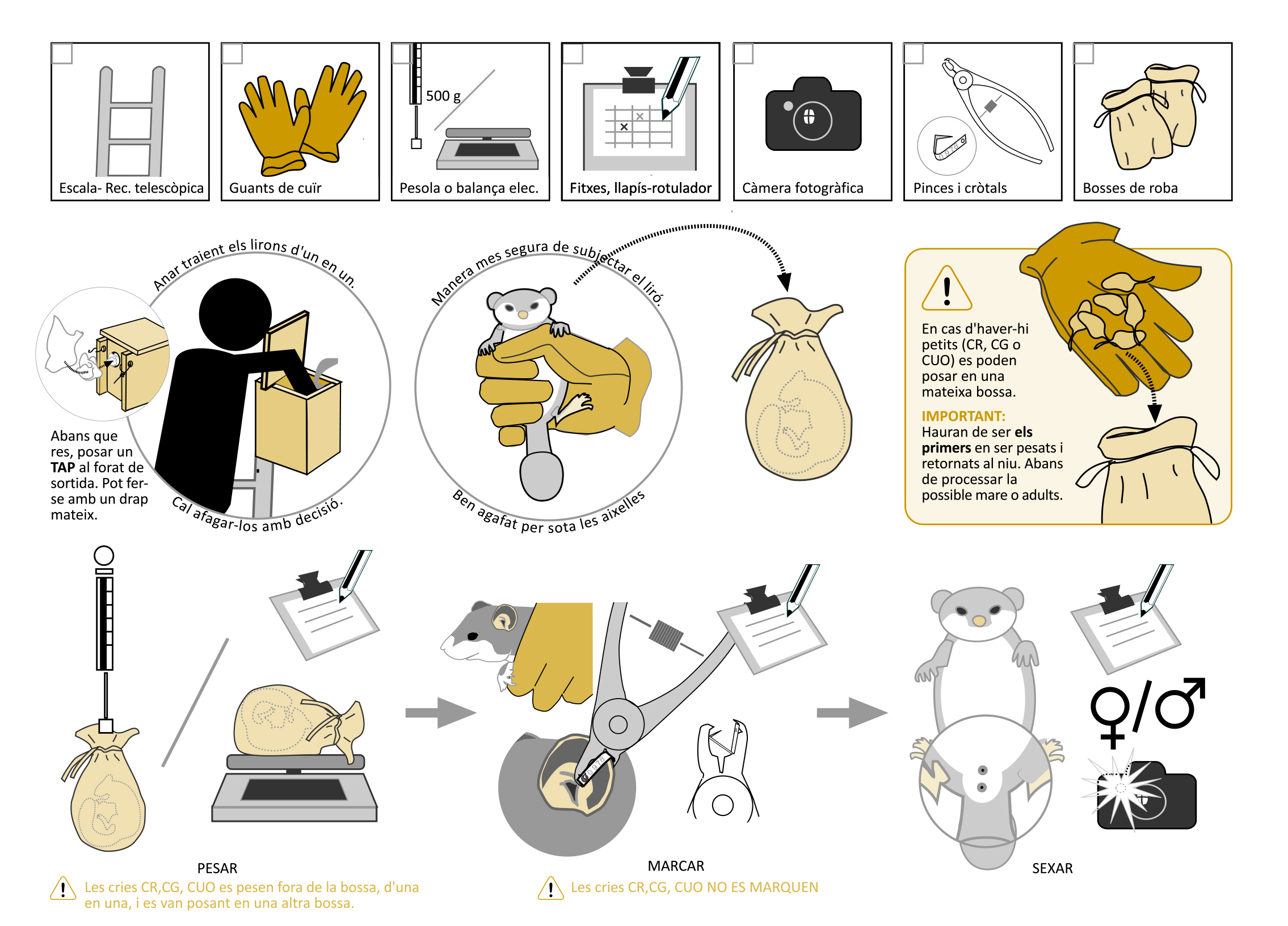 Cal revisar les caixes durant el matí, ja que és quan el liró està més inactiu i es troba descansant dins les caixes. Seguint el protocol avançat s’aconsella anar sempre acompanyat i manipular amb molta cura els exemplars de liró gris o de rata cellarda (la resta d’espècies no es manipulen però s’anota la seva presència).